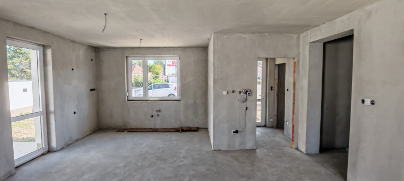 A lakóépület jelenlegi készültségi szintje emelt szintű fűtéskész állapotú, továbbá az ingatlan vételára tartalmazza a 300 m2-es telekrészt, a felépítményt, a kerítést, az épített kukatárolót, 3 db gépkocsi parkolót, szegélyezett tereprendezést, térburkolatokat és járdákat, az önálló közüzemi mérőórákat, valamint a lenti leírásban olvasható műszaki tartalmat.