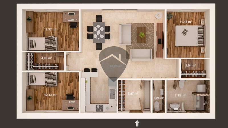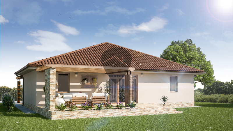 A praktikusan tervezett házban a szobákon kívül tágas és napfényes amerikai konyhás nappali, egy gardrób, fürdőszoba és egy háztartási helyiség is kialakításra kerül.